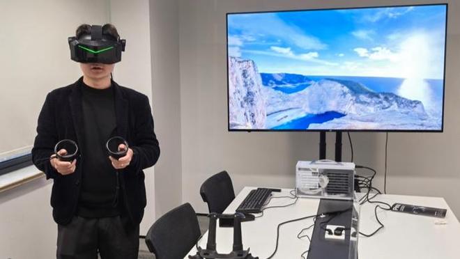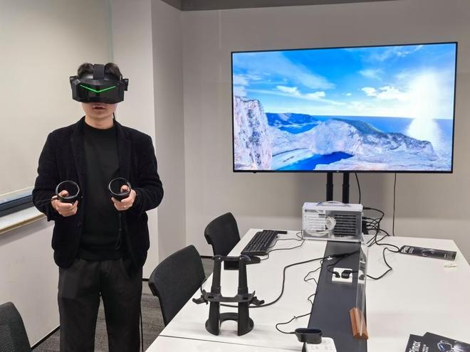 AR眼镜为现实世界加上了数字的翅膀,VR则让我们跃入虚拟世界。戴上小派VR头显设备,记者看到了壮美的峡谷风景——脚下和四周都是红褐色岩石,岩壁陡峭,一条河在百米深处流淌。操控手柄,就能“步行”游览,画面清晰度很高,视野也很开阔。“这是全球首款视网膜级超清画质的VR头显,视场角达到127度。”小派科技员工说,“除了文旅项目,它还用于汽车和飞机驾驶培训、游戏等领域,给人身临其境的体验。”
