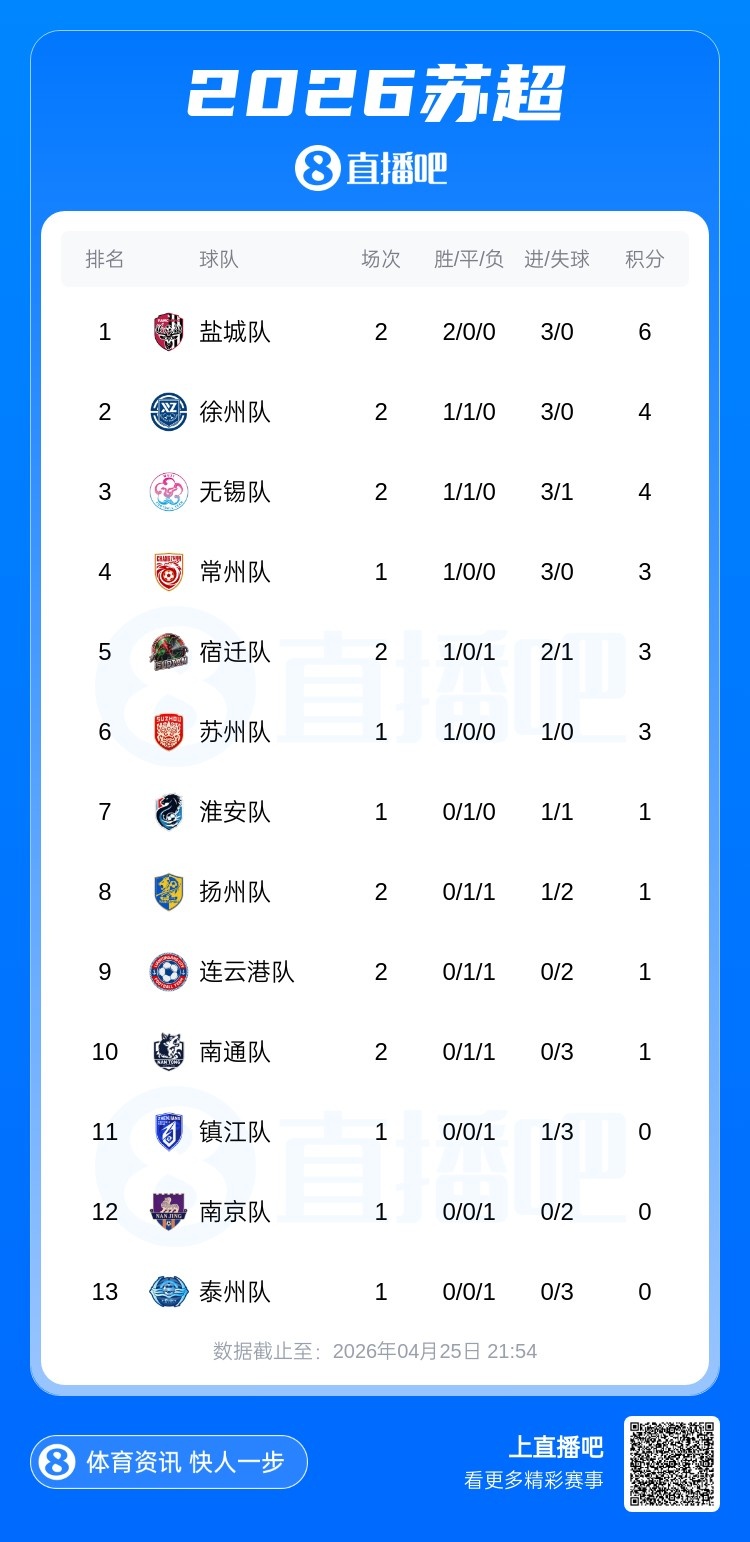 盐城队2连胜之后,暂时6分领跑苏超,徐州和无锡4分排名其后。镇江、南京和泰州今日没有比赛,均为0分排名倒三。