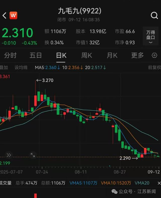 截至9月12日收盘,九毛九报收2.31港元,下跌0.43%,总市值32亿港元。